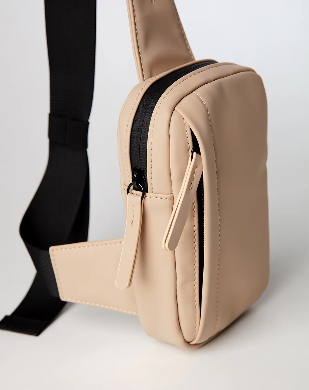 - Bolso tipo Portacelular de acabado engomado Compartimento principal con cierre mediante cremallera y bolsillo externo Asa de hombro ajustable a tono