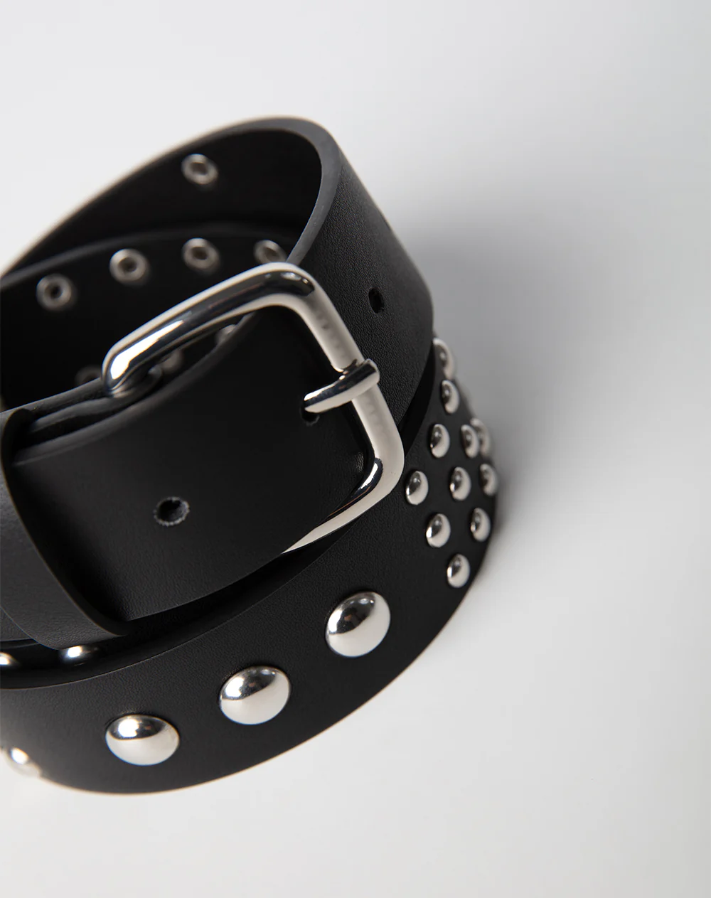 - Cinturón realizado en poliuretano con detalle de tachuelas metalizadas en tono plateado cierre con hebilla metálica