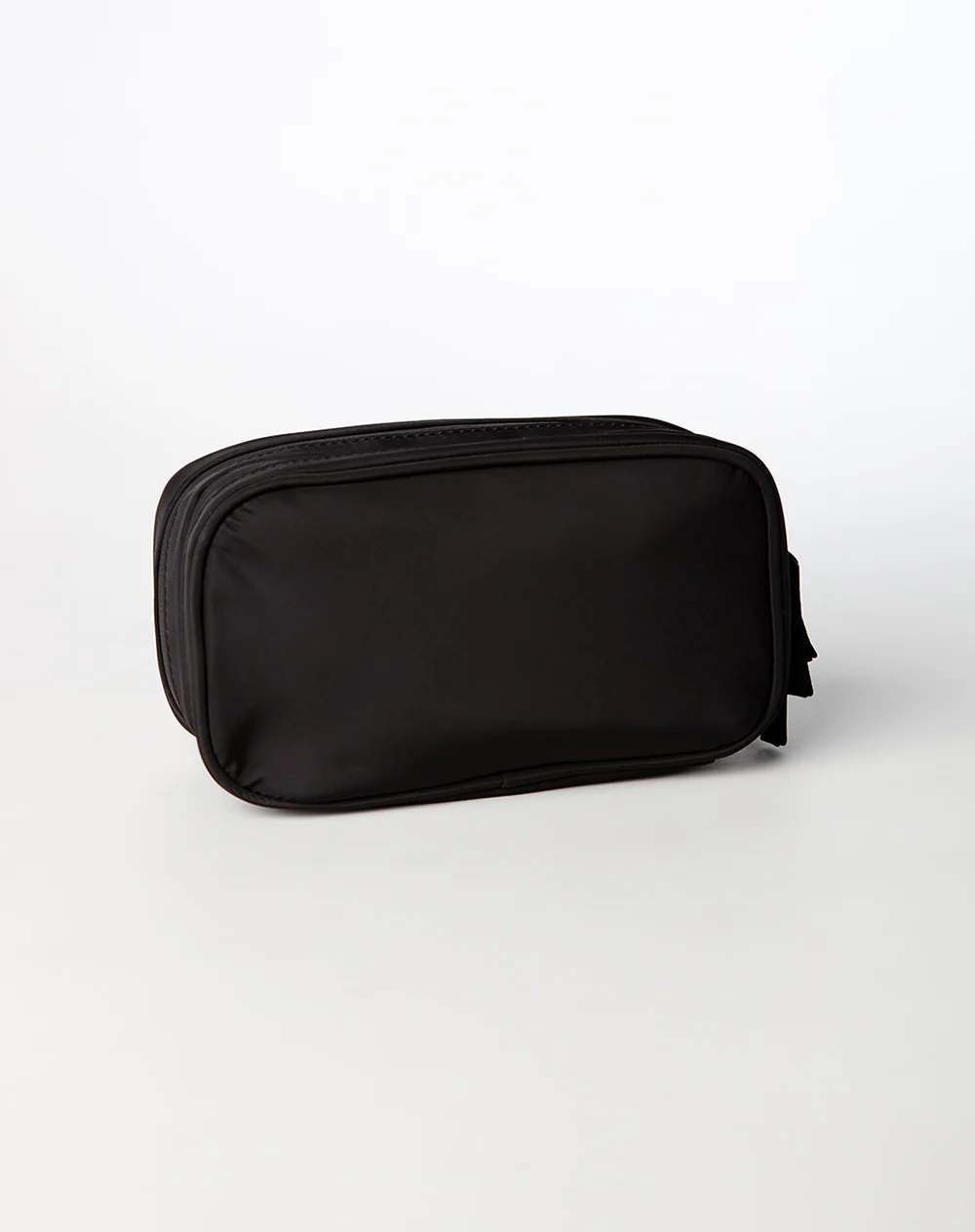 - Forma rectangular en color negro cierre mediante cremallera y bolsillo intern o Diferentes compartimentos internos
